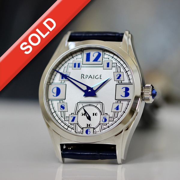 Steel case. Water Resistant to 50 meters (150 feet). The JukeBox is a tribute to the 1940’s “Moderne” style of vintage watches. The JukeBox “Broadway” evokes the Art Deco era with this dramatic dial. There will only be a limited series of 10 of the JukeBox “Broadway” made, each one numbered. The total number of JukeBox cases is only 100 in the world, each one numbered. The crown is created with a blue faceted stone.