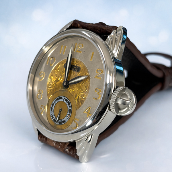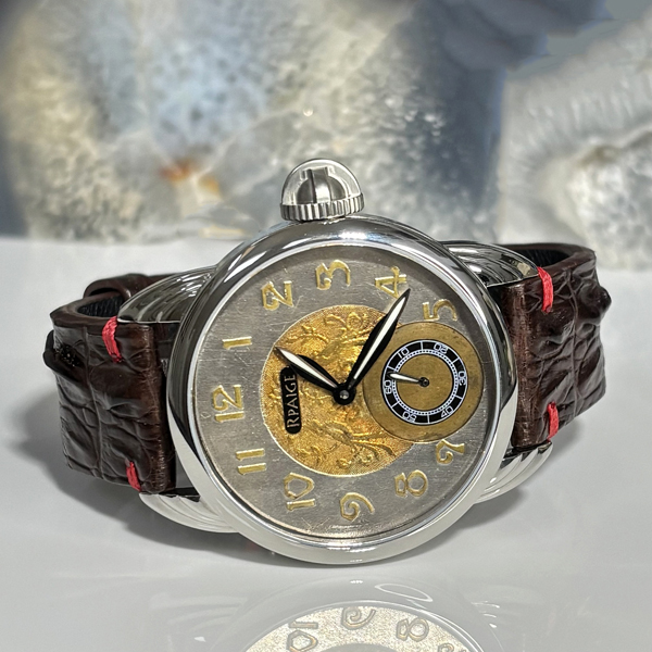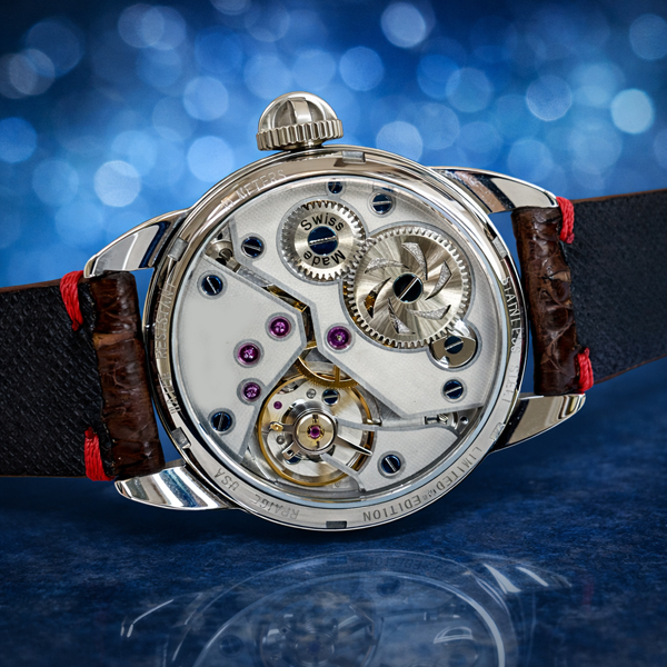 Shown with a hand made Brown Horn Back Alligator strap with red colored contrast stitching.