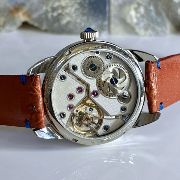17 jewel, New, Swiss, DB6, brushed finished movement, Rhodium. Glucydur, 21’600, blue screws, skeletonized ratchet wheel.