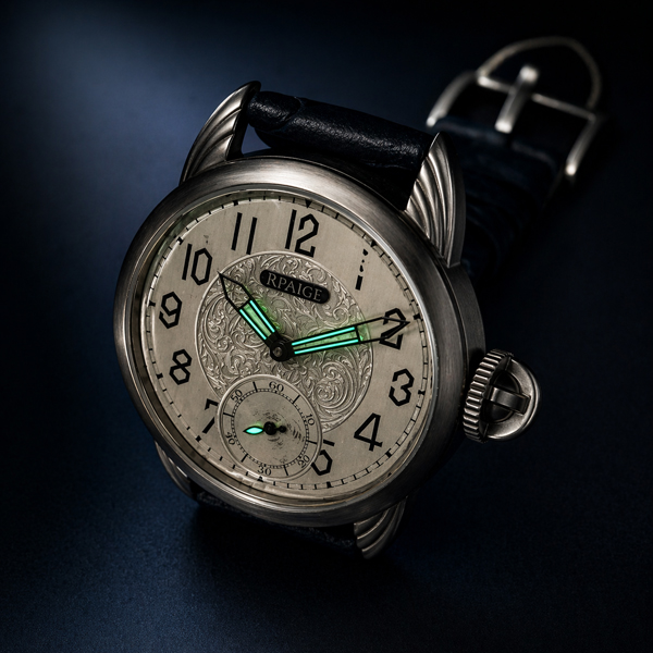 Titanium with sapphire crystal on front and display back. Water Resistant to 50 meters (150 feet). Rpaige “Helmet” style crown.. One of a kind in the world.