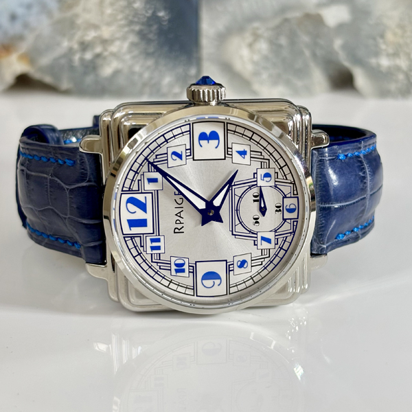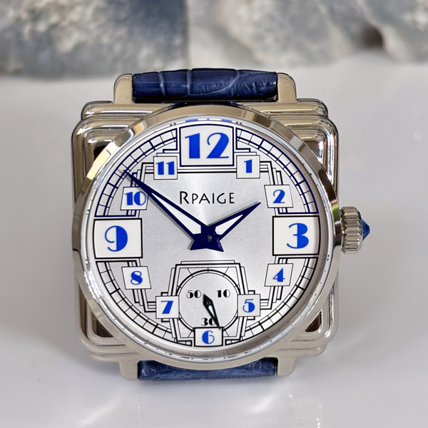 Rpaige designed Art Deco dial. Bold Art Deco Arabic numerals in blue, with luminous squares behind each number. Inspired by an antique Art Deco rotary phone.