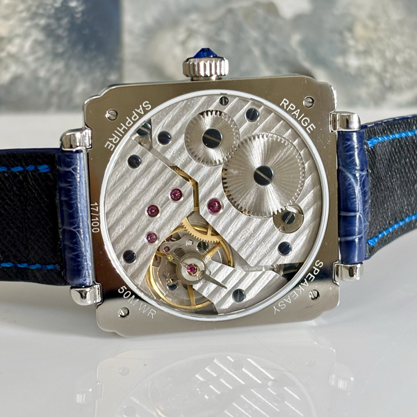 41mm Steel case. Water Resistant to 50 meters (150 feet). The Speakeasy case is evocative of the Roaring 20’s in the USA. Art Deco was the design of the era, and is reflected in architecture (Empire State Building, Chrysler Building), art (Picasso), and fashion. This Limited edition Speakeasy will have only 100 watches in the edition and only 10 watches in the “Art Deco” Edition. This is number #17 in the edition – #17/100.