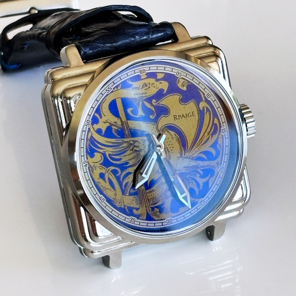 Hand made Titanium “Dragon” dial. Dragon image engraved into a titanium plate and hand colored in gold and Blue. Outside ring of engraved 60 minute indicator dial engraved into the titanium. Art Deco inspired chrome hands with luminous.
