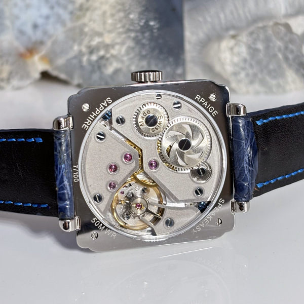 41mm Steel case. Water Resistant to 50 meters (150 feet). The Speakeasy case is evocative of the Roaring 20’s in the USA. Art Deco was the design of the era, and is reflected in architecture (Empire State Building, Chrysler Building), art (Picasso), and fashion. This Limited edition Speakeasy will have only 100 watches in the edition. This is number #7 in the edition – #7/100.