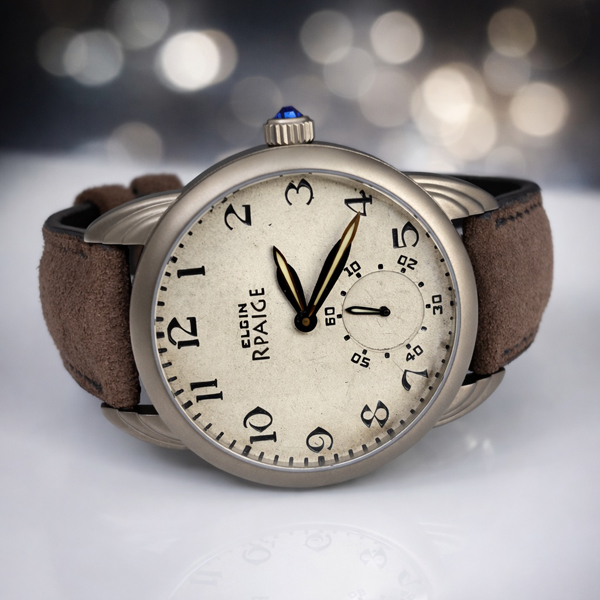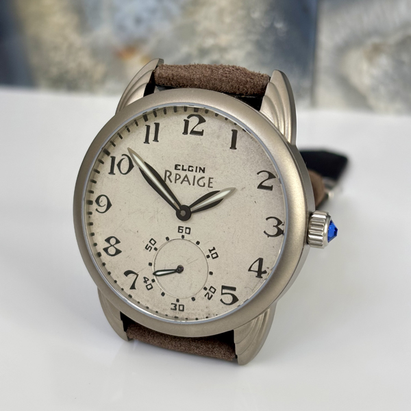 Outstanding antique Elgin USA dial from the 1930’s. Beautifully aged patina “Tropical” dial finish. Bold Art Deco Arabic numbers. Rpaige designed Chrysler Building style hands with luminous.