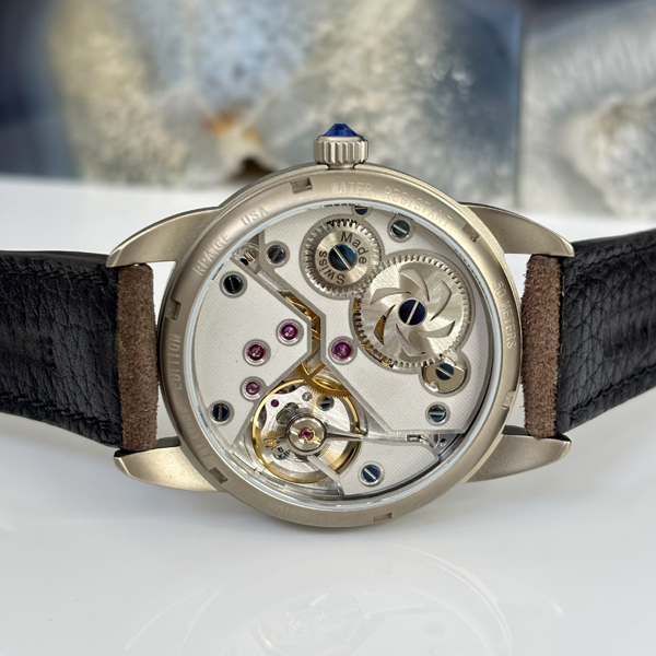 Titanium with sapphire crystal on front and display back. Water Resistant to 50 meters (150 feet). Rpaige Faceted blue stone crystal style crown.. One of a kind in the world.
